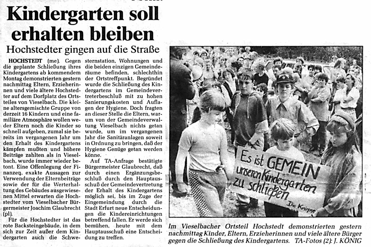 Die Hochstedter hatten vergeblich um den Erhalt des Kindergartens gekämpft. Es gab sogar Demonstrationen mit Straßensperren, die jedoch nichts brachten, außer einen Aufschub der Schließung.